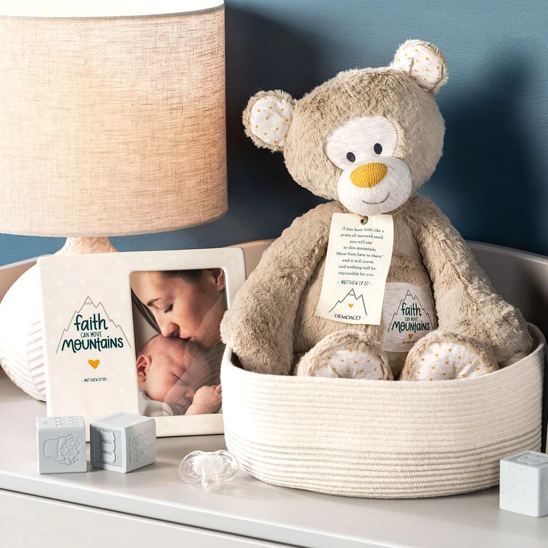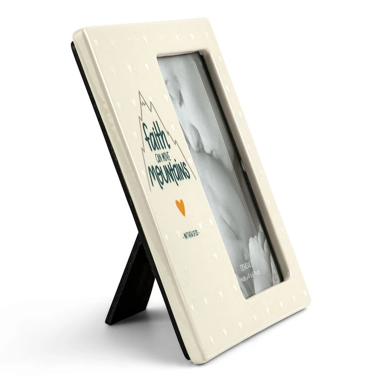 Fill your nursery with the faith of a mustard seed and teach your little one that they can move mountains with this charming picture frame from Demdaco. Ceramic frame holds a vertical 4×6 photo and features a cream-on-cream mini heart print and a Bible verse from Matthew 17:20 with mountain and heart designs. This unique frame is a heartfelt way to display memorable moments and joyfully decorate their space. It makes a wonderful gift for a baby shower, baptism or christening.